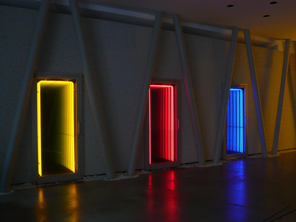 Ivan Navarro Shortcuts, 2005. 350 x 217,5 x 17 cm. Neon light,aluminum doors, mirror,one way mirror, and electric energy AP of Ed. of 3 + 1 AP.