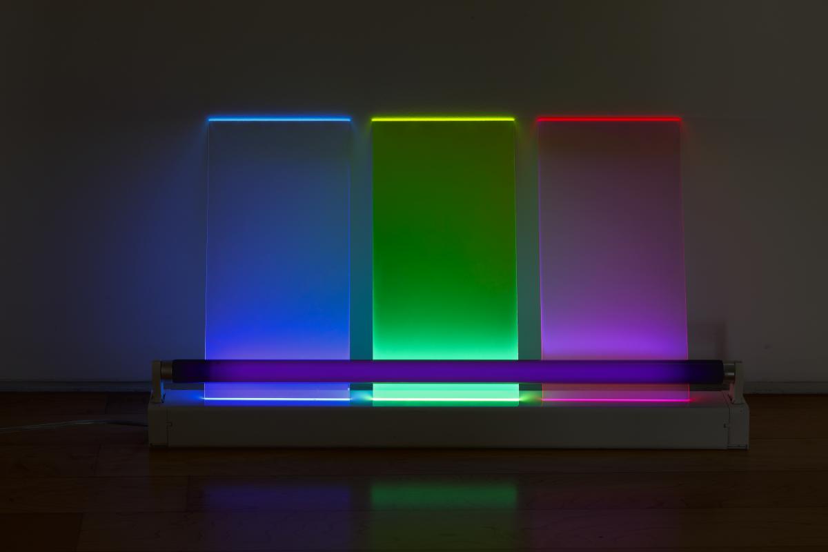 Éric Michel Screen E/A, I/IV / Ekran E/A, I/IV, unknown . 30 x 61 x 10 cm. Lighting installation, black light and 3 flourescent acrylic boards.