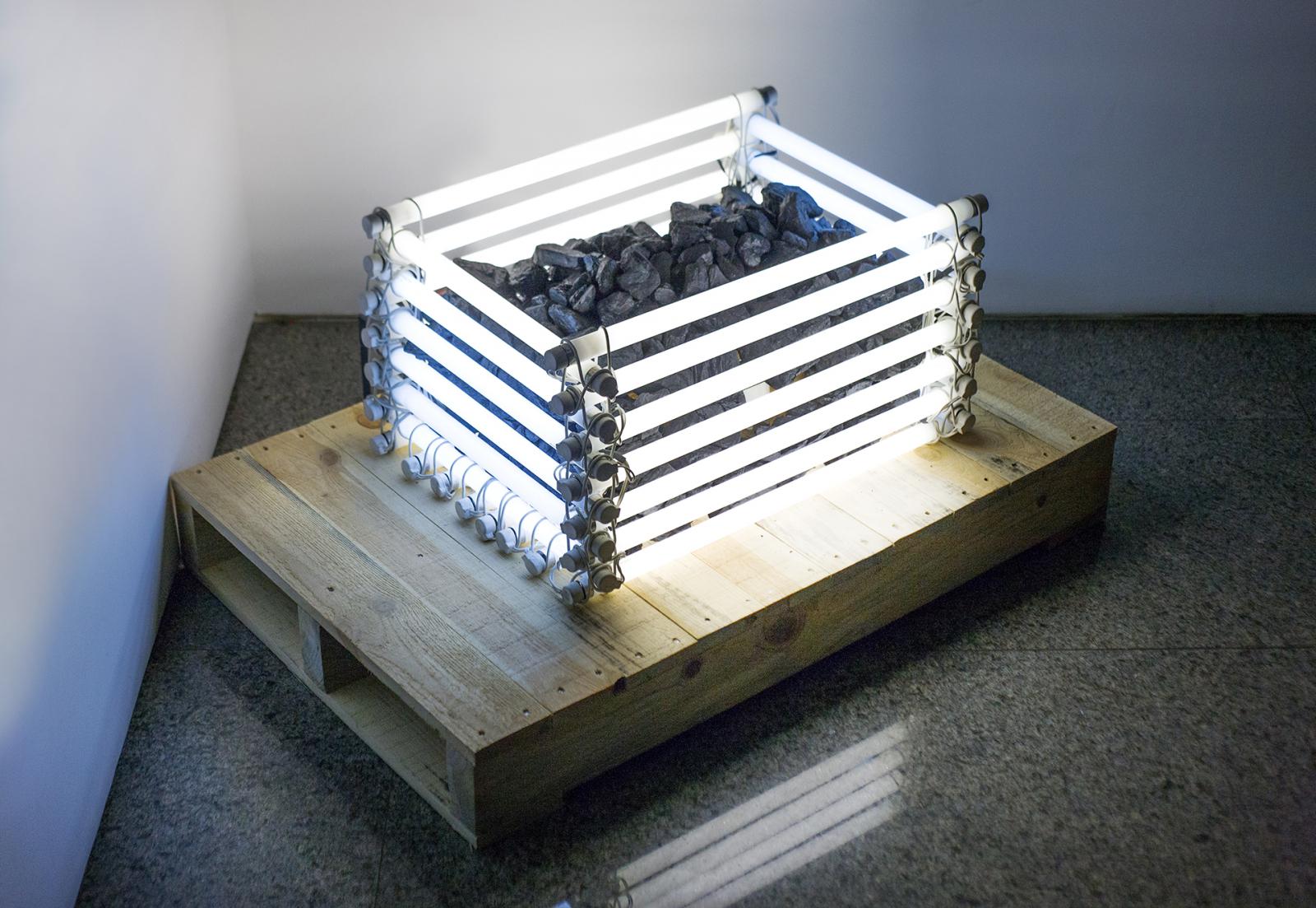 Alejandro Almanza Pereda 153.68 Net Hours / 153.68 Net Saat, 2007. 44 x 61 x 33 cm. Fluorescent light bulb, coal, electricity Ed. 4/5 + 2 AP.