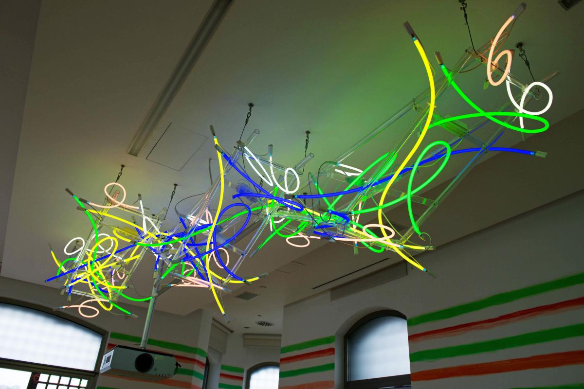 Keith Sonnıer Ballroom Chandelier Installation/ Balo Salonu Avize Yerleştirmesi, 2007. 600 x 100 x 100 cm. Glass tubes with argon and neon, cable, transformer.