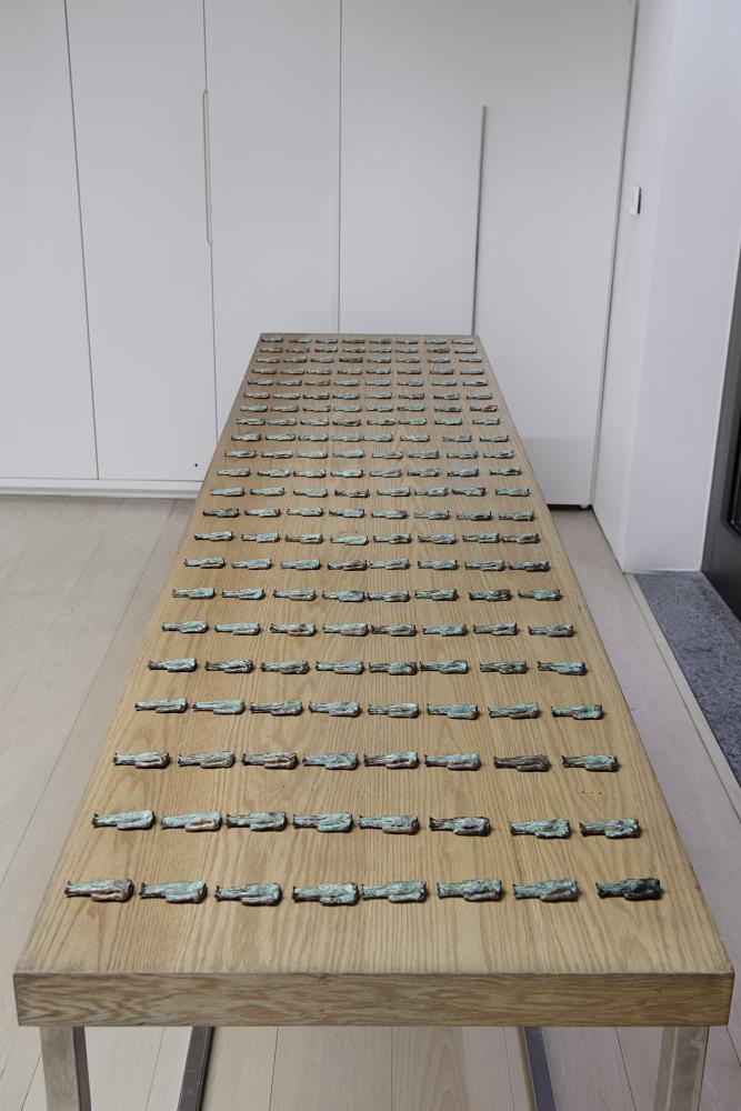 Burak Bedenlier Uzanmak / Lie Down, 2010. 6 x 2 cm (each) 75 x 200 x 58 cm (pedestal). Wood, bronze.