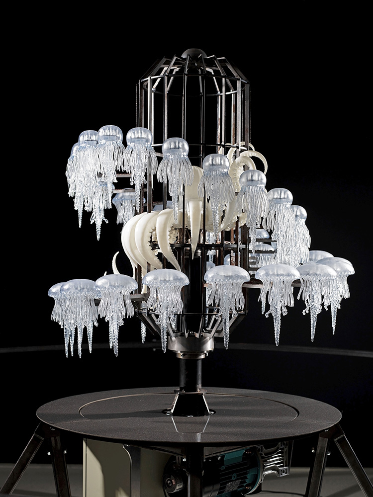 Mat Collishaw Sounding Sirens / Çınlayan Sirenler, 2023. 300 x 300 x 210 cm. Akrilik, alüminyum, LED ışıklar, motor, reçine, çelik.