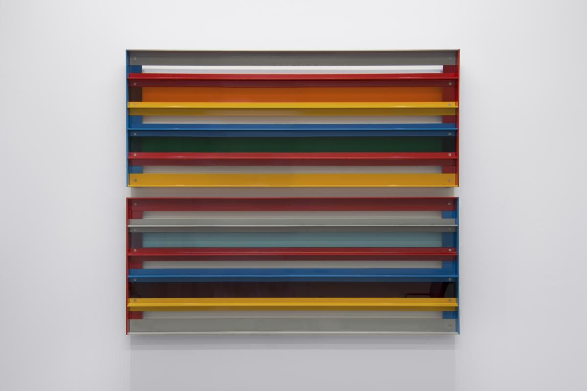 Liam Gillick Shifted Analysis/ Kaydırılmış Analiz, 2007. 121 x 50 x 9 cm each. Aluminium screen, powder-coated and anodized aluminium, plexiglass.