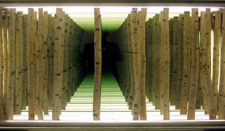 Anthony James Birch, 2010. 152.5 x 406.5 x 30.5 cm . Birch trees, polished steel, glass, LED lights Wall mounted birch-sculpture .