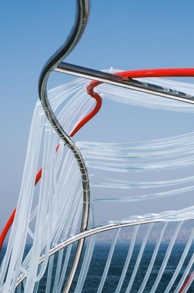 Pınar Yoldaş Saltwater Heart/ Tuzlu Su Kalbi, 2015. Dimensions variable. Water pumps, air compressor, water, stainless steel construction pipes.